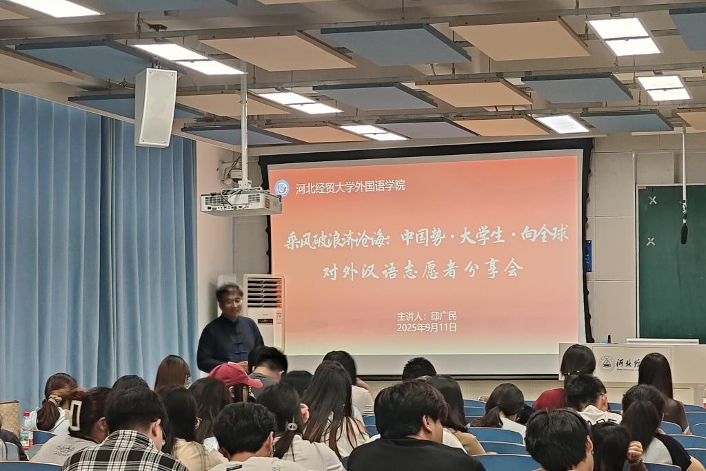 9月11日,永利官网成功举办“乘风破浪济沧海:中国势·大学生·向全球”对外汉语志愿者分享会。活动特邀尼泊尔孔子学院邱广民老师担任主讲,学院党委书记仇静莉、副书记刘磊、团委书记、毕业班辅导员及2022级全体学生参加。