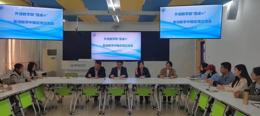 2023年10月20日下午,外语教学部组织了“圆桌π--英语教学中期反馈交流会”活动,yl7703永利官网书记仇静莉、院长张润、外语教学部主任李钢出席,来自我校10多个学院的20多位学生代表参加了交流活动。